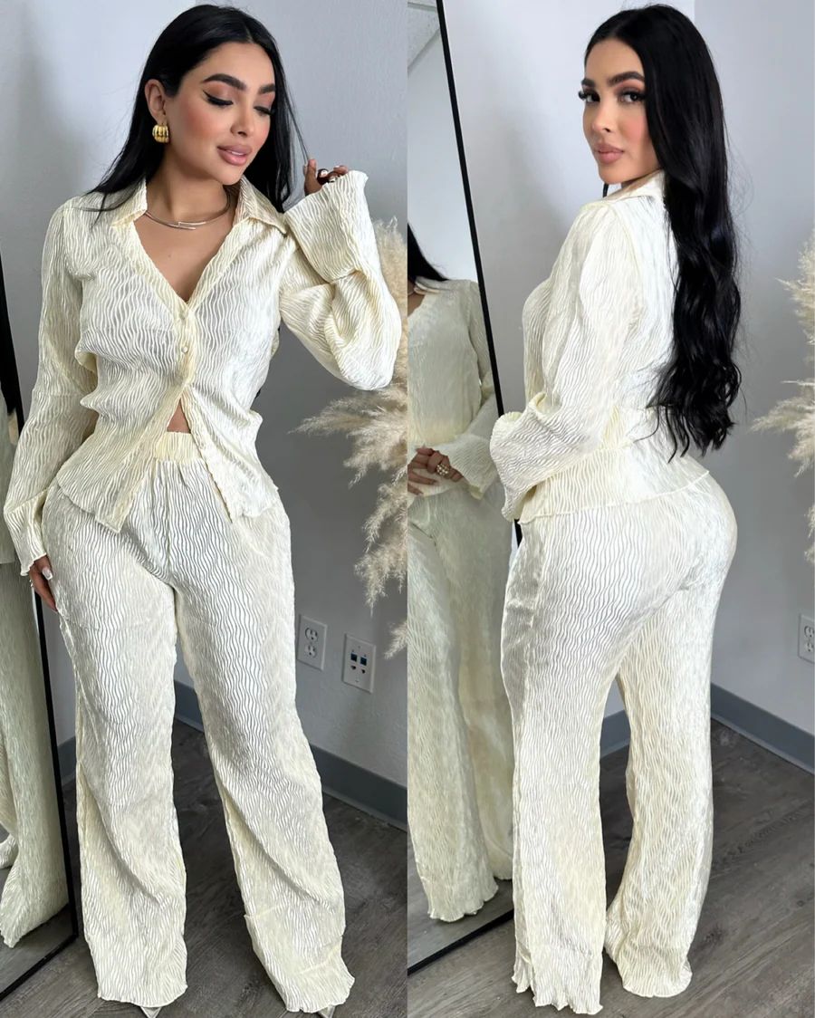 conjunto blusa y pantalón en tela tipo satin corrugada ,pantalón con elástico en cintura.